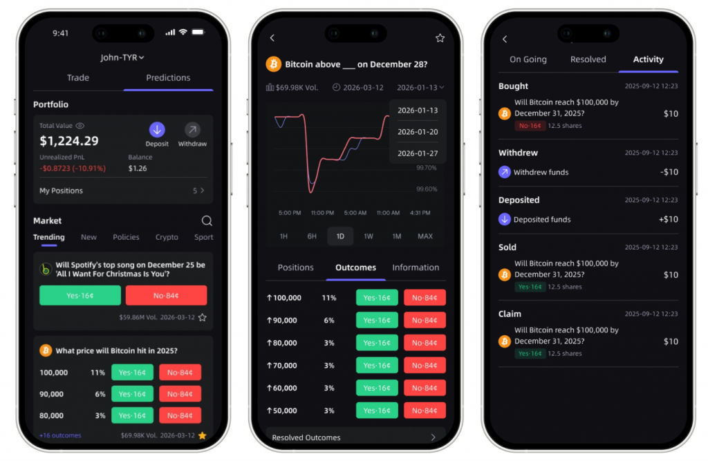 - Browse crypto prediction markets, select your position (Yes or No), and confirm your trade