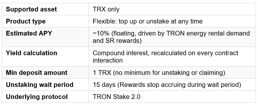 The TRX staking product is built on TRON Stake 2.0, the TRON blockchain’s native staking protocol. Yield compounds automatically on every interaction, you can add to your stake at any time (minimum of 1 TRX per deposit), and submit an unstaking request (with a 15 day withdrawal queue).