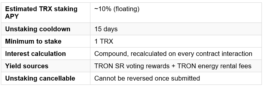 The ~10% APY figure is a floating estimate based on current TRON network conditions including TRON energy rental demand and Super Representative voting reward rates. It is subject to change without notice and is not a fixed or guaranteed return.